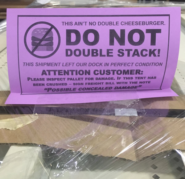 Midwest Retail uses “no stacking” tents to notify freight carriers not to stack fragile items and to provide a visual signal to our customers that damage may have occurred en route.